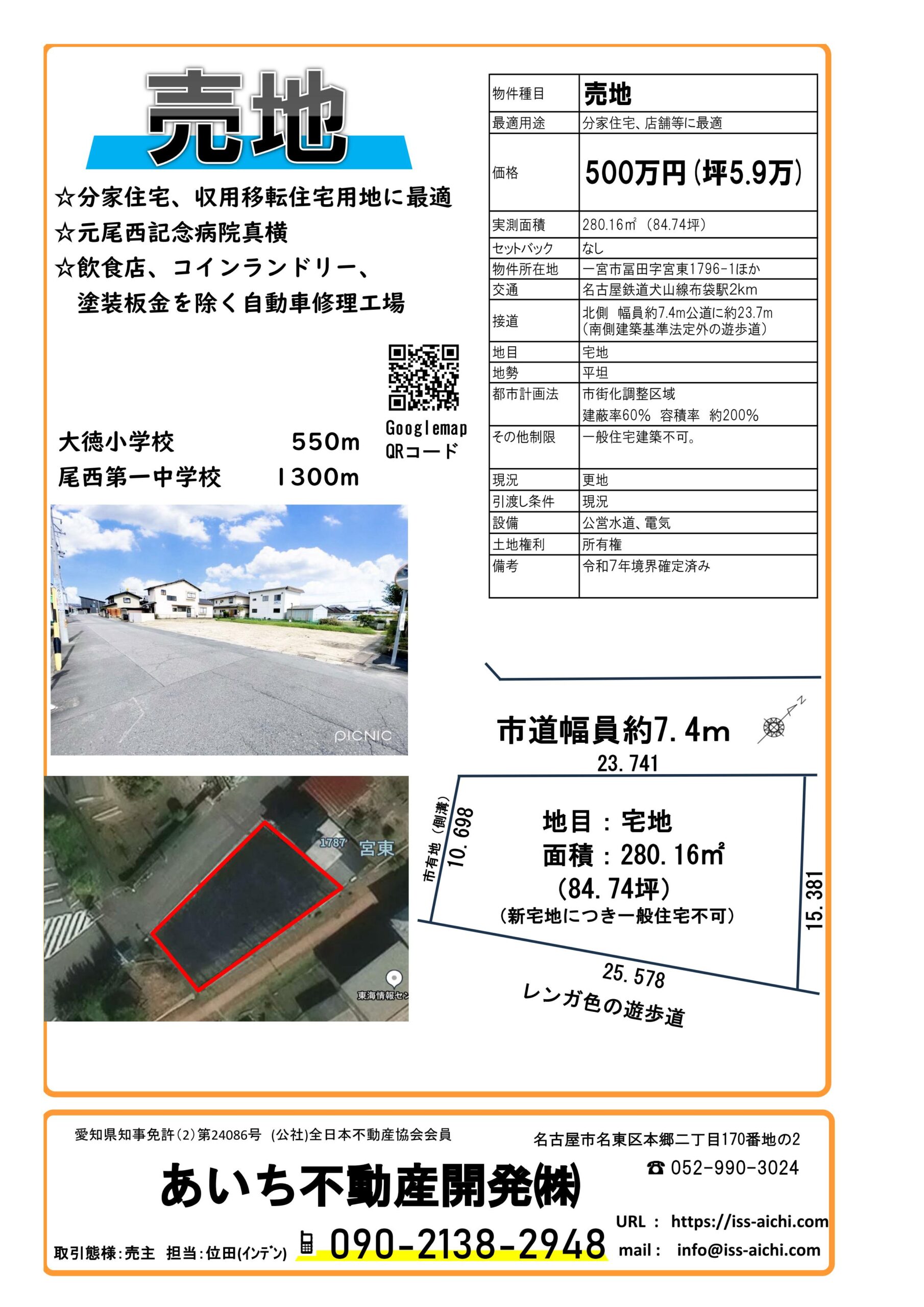 2026年3月31日 / 最終更新日時 : 2026年3月31日 issaichi 未分類 一宮市冨田分家用地 一宮市冨田字宮東の分家住宅用地のご案内です。 調整区域の新宅地で一般住宅は建ちません。 分家住宅のほかは、飲食店や 板金塗装を除く自動車修理工場を 建築することができます。 (一宮市の許可要す) 上記地図の通り、元尾西市民病院の東隣りに位置しています。 現在は訪問看護の事務所と、療育センターとして利用 されています。 南側にはレンガ色の遊歩道が整備されており、 ゆっくり散歩ができるようになっています。